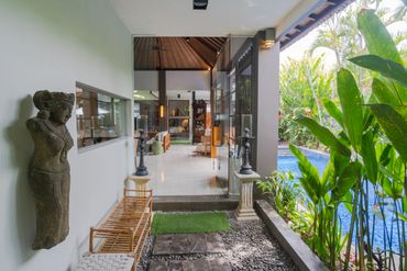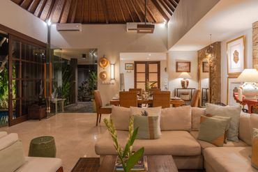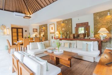 Enter a tropical oasis with this spacious, open-concept living room that effortlessly blends luxury with island charm. The room is filled with natural light streaming through large floor-to-ceiling windows, showcasing lush greenery with your very own private pool. Plush sofas and armchairs offer ample seating, surrounded by artisan decor that reflects the beauty of the surroundings.