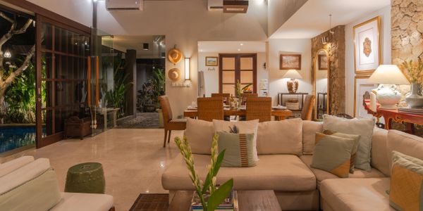 Enter a tropical oasis with this spacious, open-concept living room that effortlessly blends luxury with island charm. The room is filled with natural light streaming through large floor-to-ceiling windows, showcasing lush greenery with your very own private pool. Plush sofas and armchairs offer ample seating, surrounded by artisan decor that reflects the beauty of the surroundings.